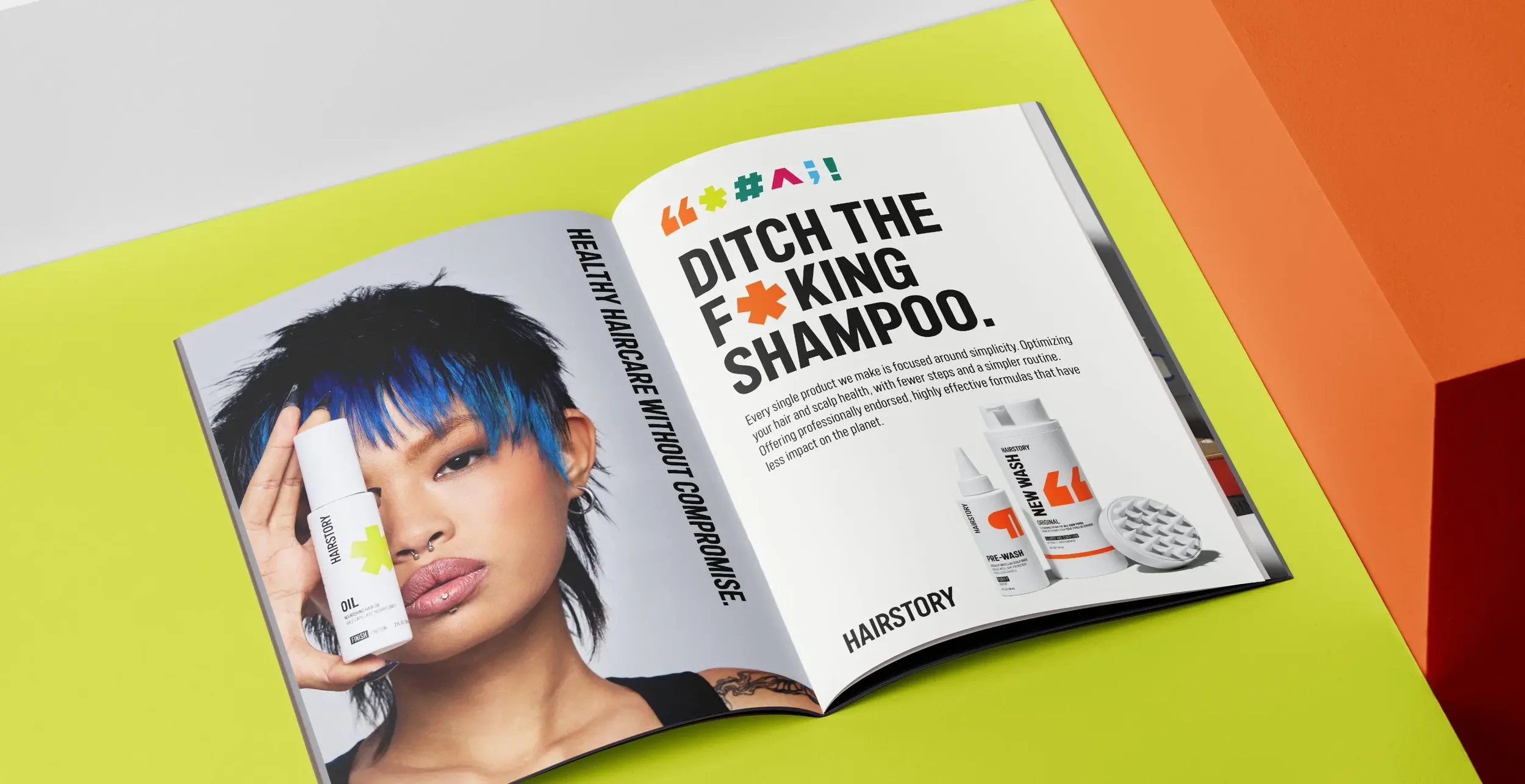 In the often-maximalist-minded world of beauty, promising less can be a radical zag. But that’s the path team Tether and I pursued when we partnered with Hairstory to restyle this haircare brand committed to reimagining the category. With a popular detergent-free, multitasking cleansing cream as their hero product, Hairstory was already making waves. What they needed was a compelling, truly differentiating brand story and a refreshed visual language to animate this disruptive ethos while resonating with consumers and hairdressers alike.